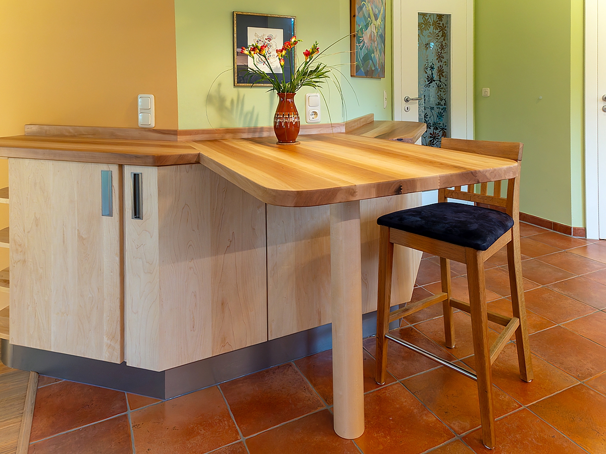 Die Arbeitsplatten und stark beanspruchten Flächen sind aus Ahorn mit Baumkante, passend mit dem Altholz kombiniert.